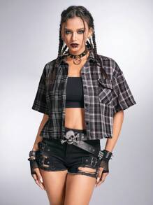 Grunge Punk Women's Short Plaid Shirt With Multi-Color Patchwork