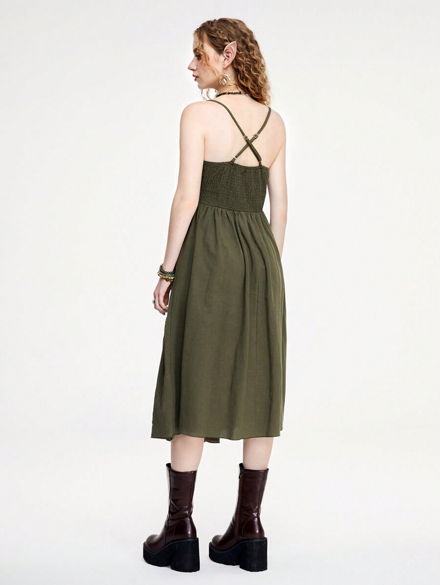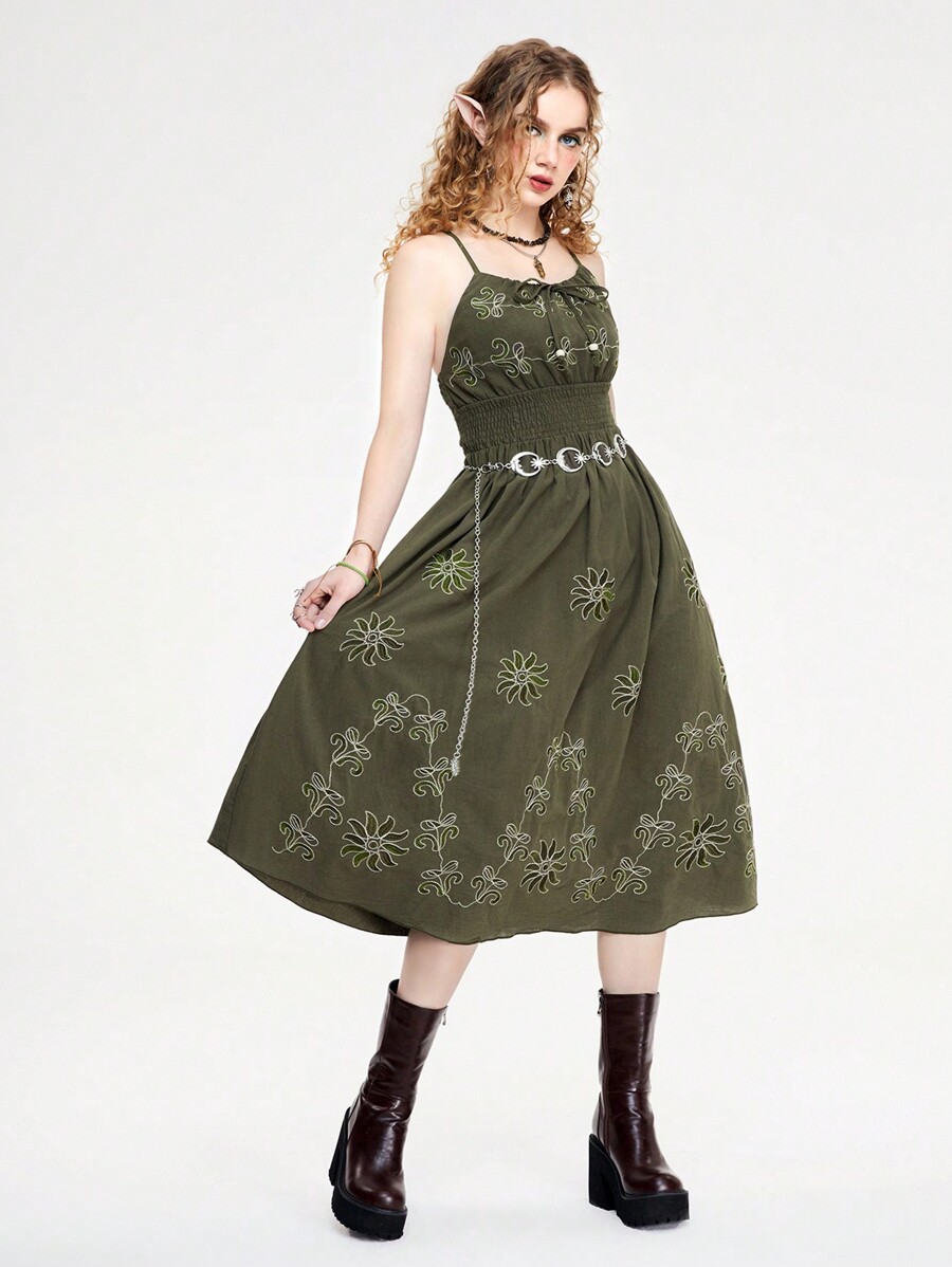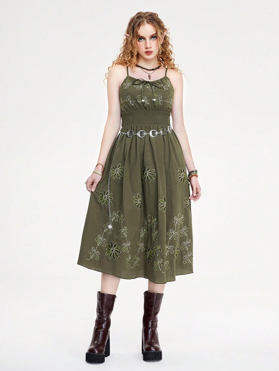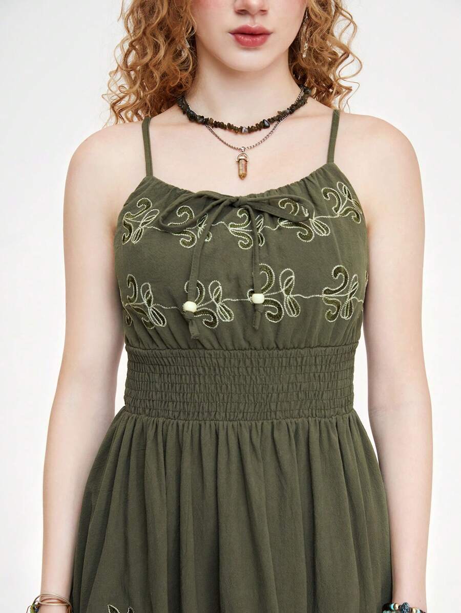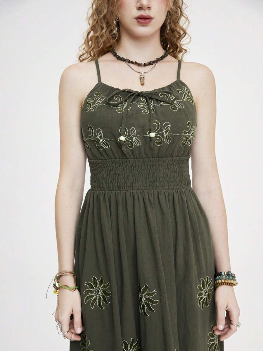 Women's Summer Casual Floral Embroidered Spaghetti Strap Green Dress