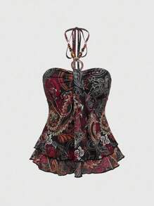 Women's Vintage Hippie Resort Style Paisley Print Wooden Bead Necklace Halter Tank Top
