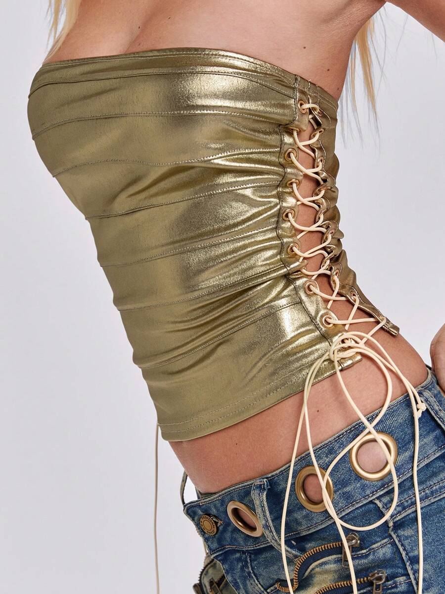 Women's Y2K Sexy Gold Special Fabric Side Tie Design Bandeau Top, Suitable For Music Festivals, Parties, Concerts, Vacations, Dates, And Casual Outings