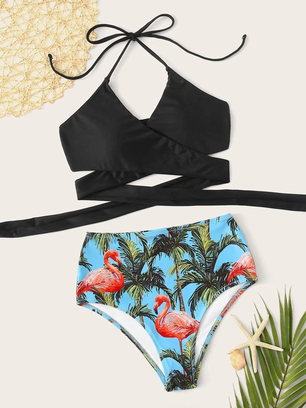 Wrap Top With Random Flamingo Print Bikini Set
