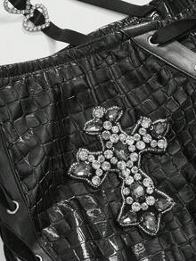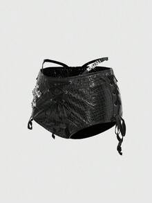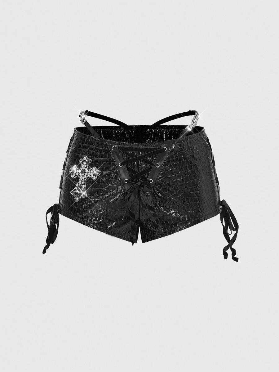 Grunge Punk Y2K Baddie Cross Rhinestone Decor Side Tie Waistband Decor Ultra Low Rise Textured PU Micro Shorts