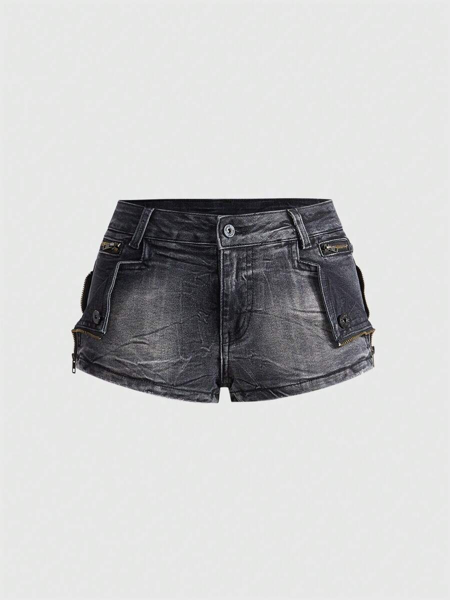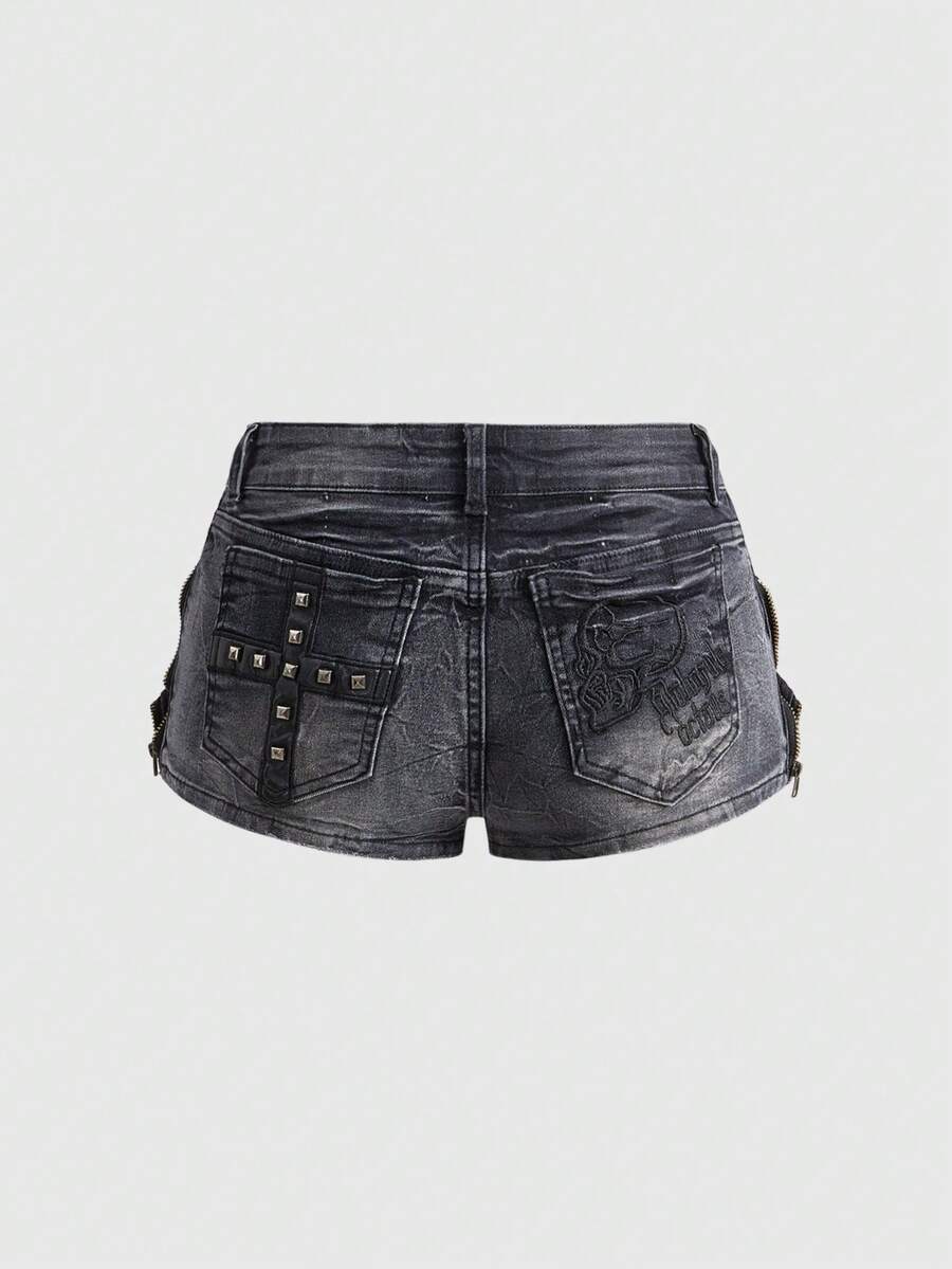 Grunge Punk Y2K Baddie Skull Embroidery & Rivet Decorated Super Low-Rise Women Denim Shorts