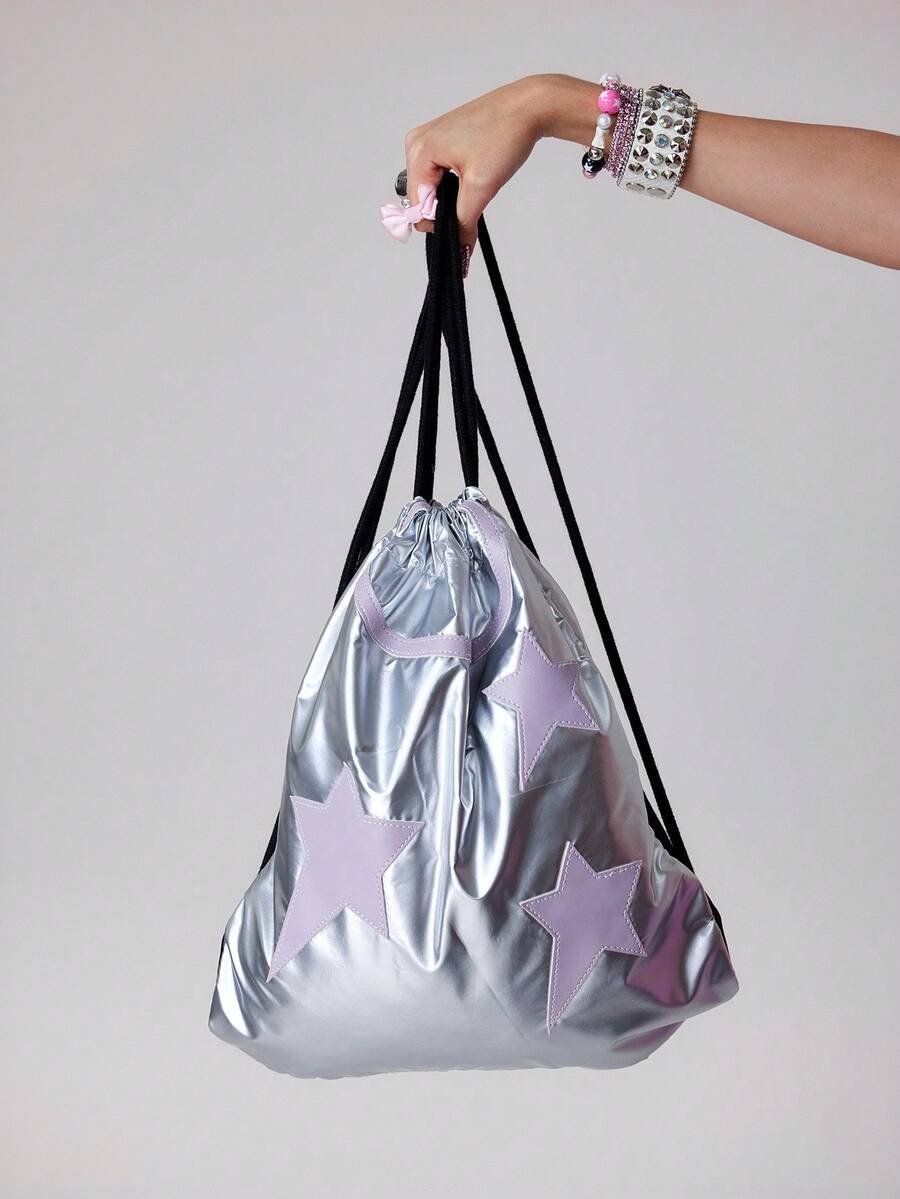 Grunge Punk Y2K Cute & Sexy Bow Drawstring Backpack For Women Minimalist Silver Techno Chic Drawstring Pouch, Versatile Waterproof Lightweight Large Capacity Foldable Storage Bag, Gym Bag, Suitable For Casual, Travel, Commute, Back Top School