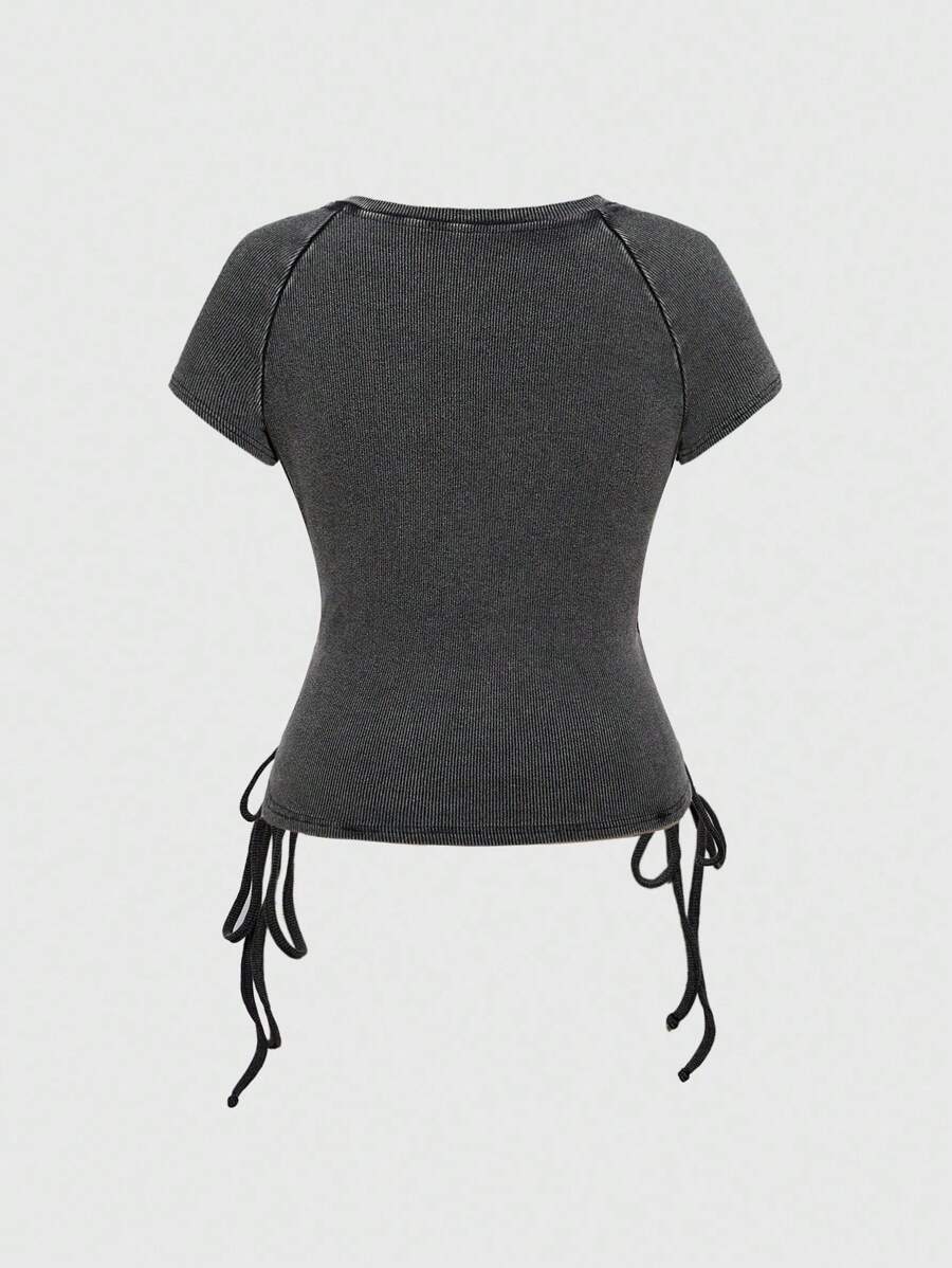 Grunge Punk Y2K Distressed Punk Side Slit Drawstring Design Washed Snowflake Raglan Sleeve Fitted Solid Color Versatile T-Shirt