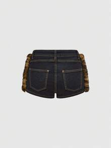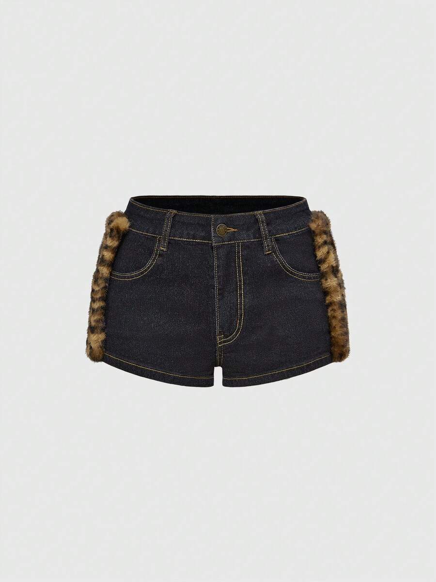 Grunge Punk Y2K Harajuku Gyaru Gal Style Patchwork Leopard Faux Fur Super Low Rise Mini Denim Shorts