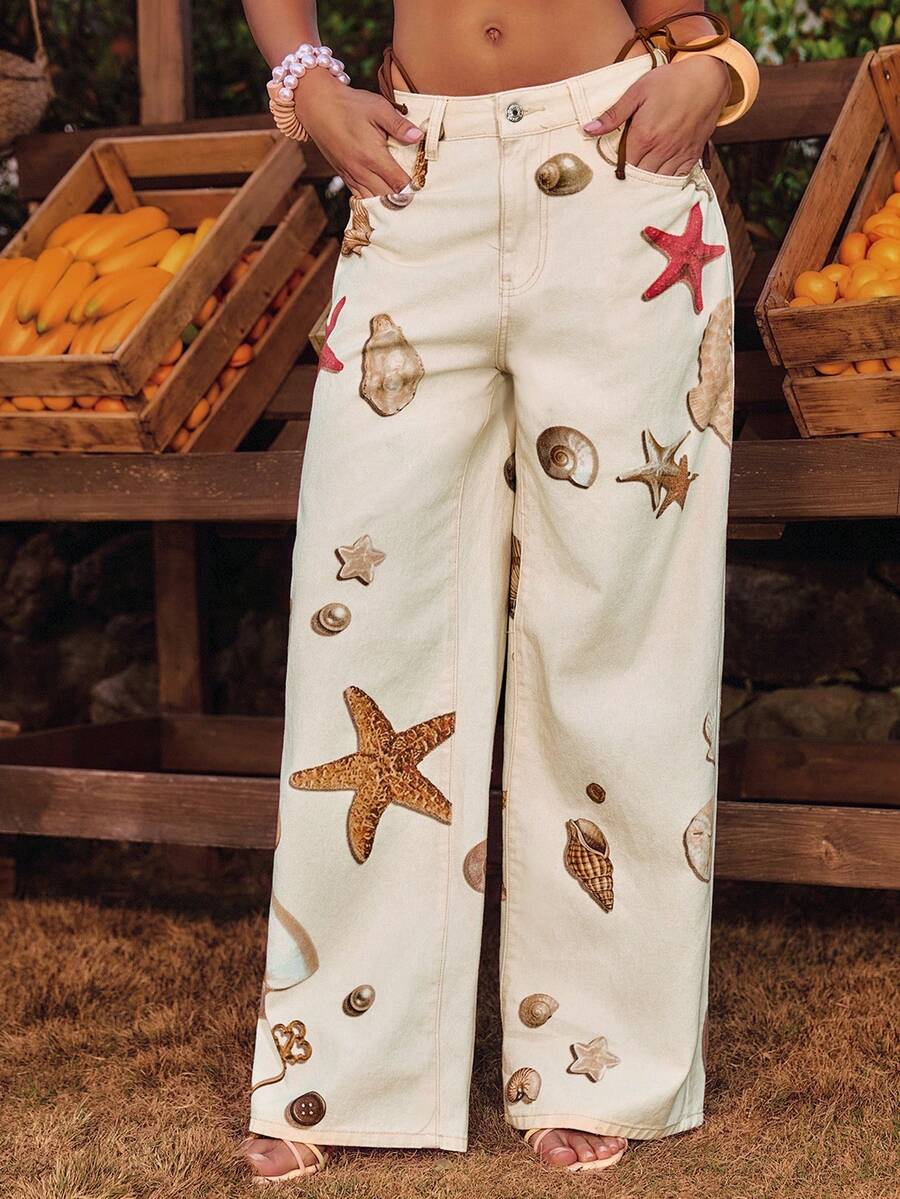 Y2K Island Girl Ocean Shell Starfish Conch Pearl Print Low Waist Loose Women Denim Jeans