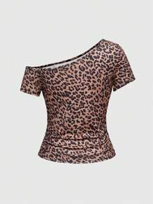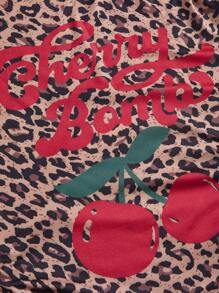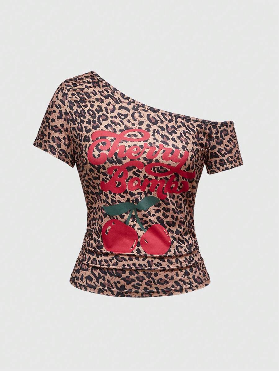 Y2K Music Festival Vintage Leopard & Cherry Print One Shoulder T-Shirt For Women