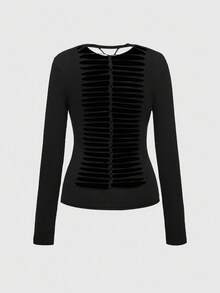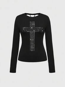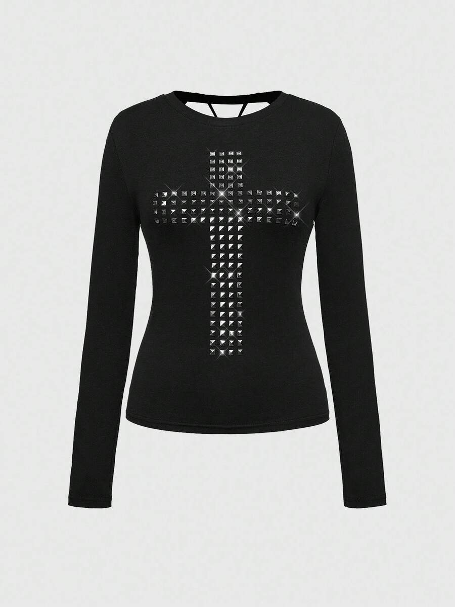 Grunge Punk Y2K Punk Cross Rivet Design Laser Cut-Out Back Slim Fit Long Sleeve T-Shirt, Solid Color Versatile