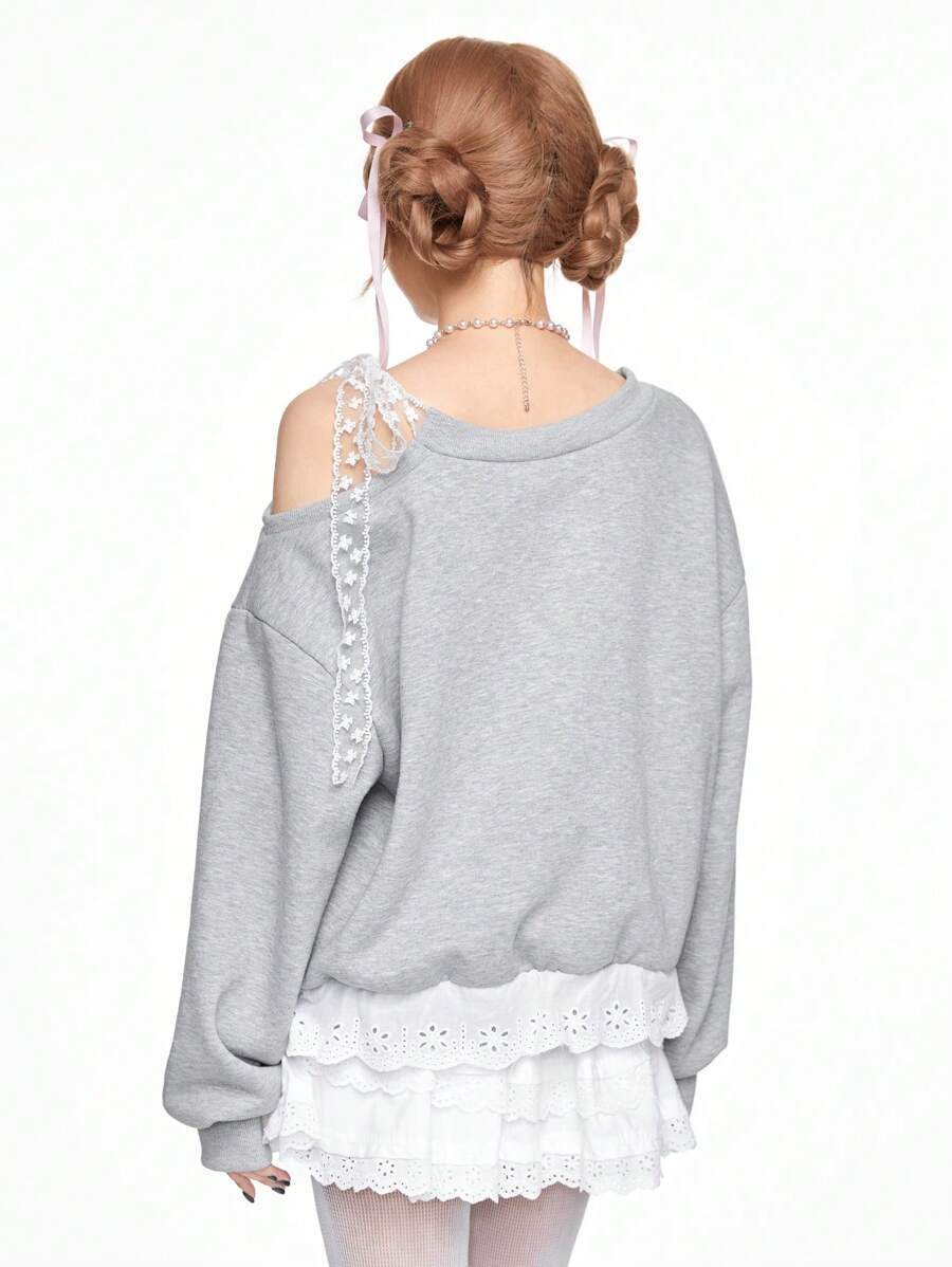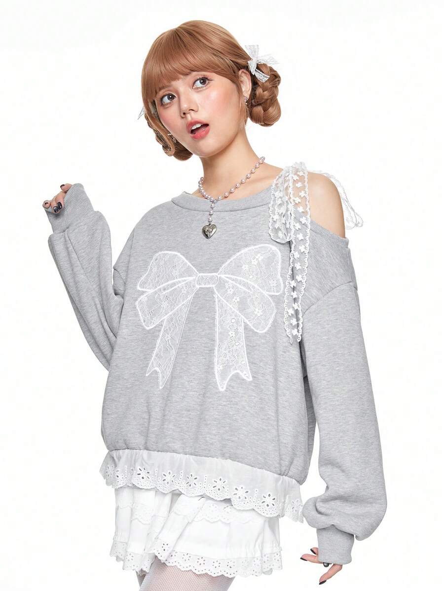 Y2K Sensual Ballet Dancer Casual Bow Lace Patch Embroidered Lace Trim Oblique Shoulder Pullover Hoodie