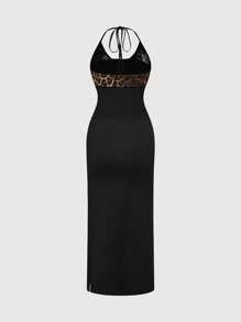 Grunge Punk Y2K Sexy Babe Leopard Contrast Color Lace-Up Side Slit Midi Dress For Women, Summer