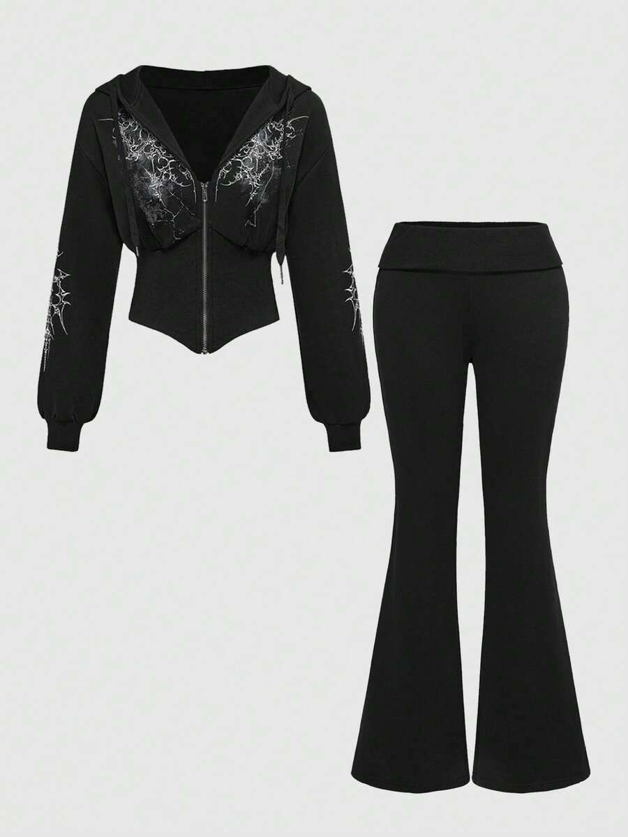 Grunge Punk Y2K Subculture Vintage Fitted Leopard Print Hooded Sweatshirt & Low-Waist Pants 2 Pieces Set