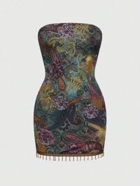 Cute Tropical Vintage Hippie Paisley Print Mesh Patchwork Tassel Hem Strapless Mini Dress, Suitable For Graduation, Easter, Concert, Nashville Vacation, Elegant