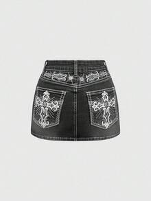Grunge Punk Y2K Vintage Crop Top With Cross & Wing Embroidery Pocket Mini Skirt (With Leggings)