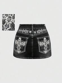 Grunge Punk Y2K Vintage Midriff-Baring Mini Skirt With Pocket, Cross & Wing Embroidery (Includes Leggings)