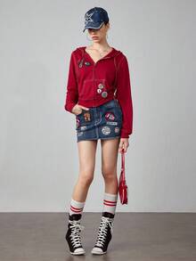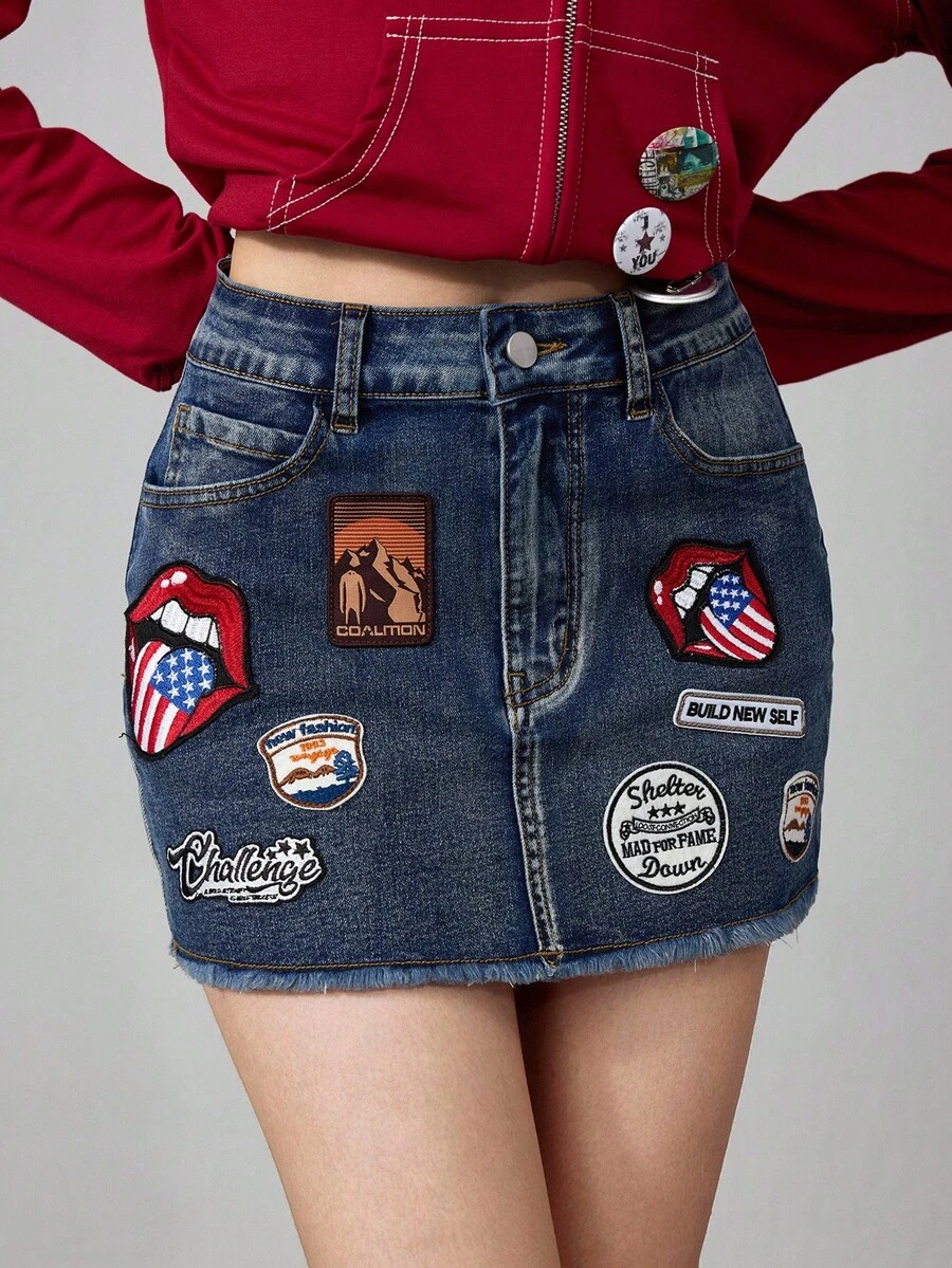 J-Fashion Y2K Vintage Streetwear Women Low Waist Cropped Bodycon Embroidered Union Jack Lips Denim Mini Skirt