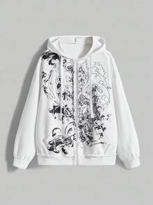 Grunge Punk Y2K Women Gothic Floral Print Fitted Zip-Up Hoodie, Casual Sporty Sweatshirt, Halloween