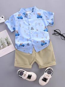 Young Boy Cartoon Graphic Button Front Shirt With Shorts Summer Holiday