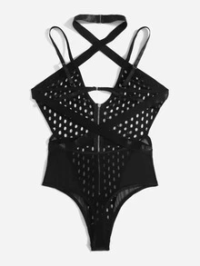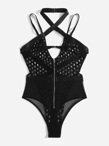 Zip Front Fishnet Sheer Teddy Bodysuit