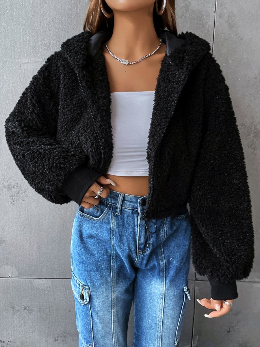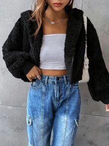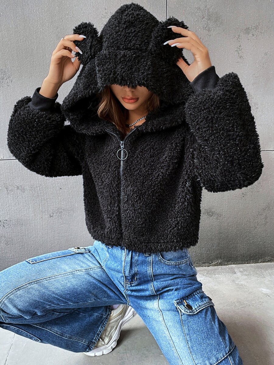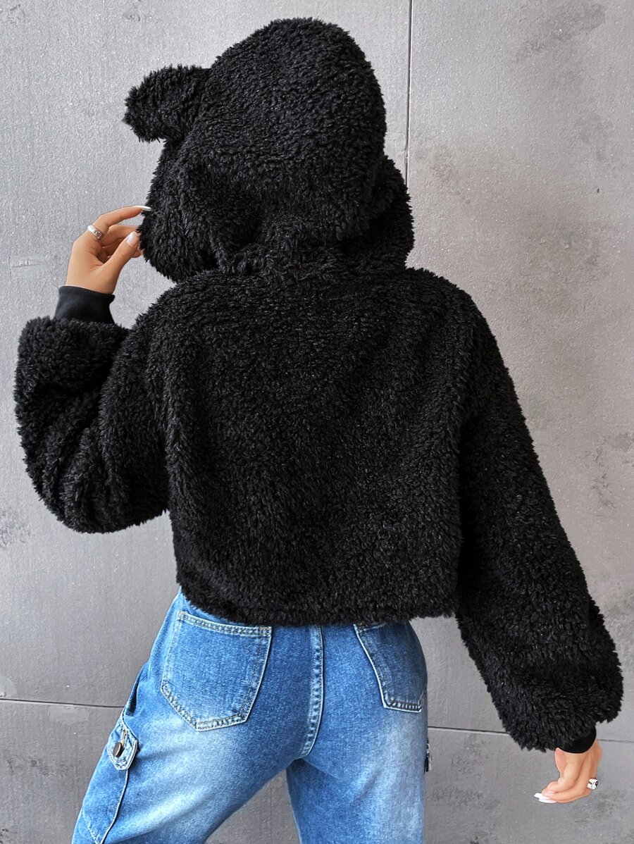 Zip Up 3D Ears Design Hooded Crop Teddy Jacket