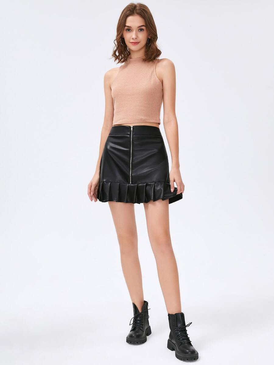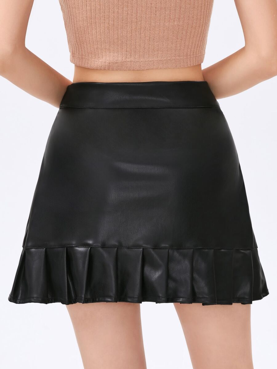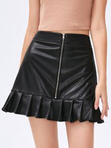 Zip Up Ruffle Hem Pu Leather Skirt