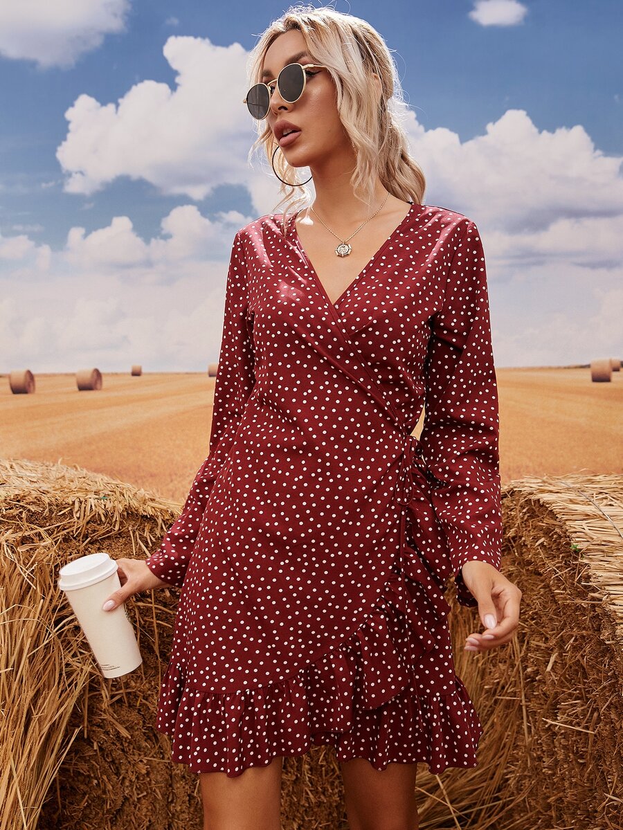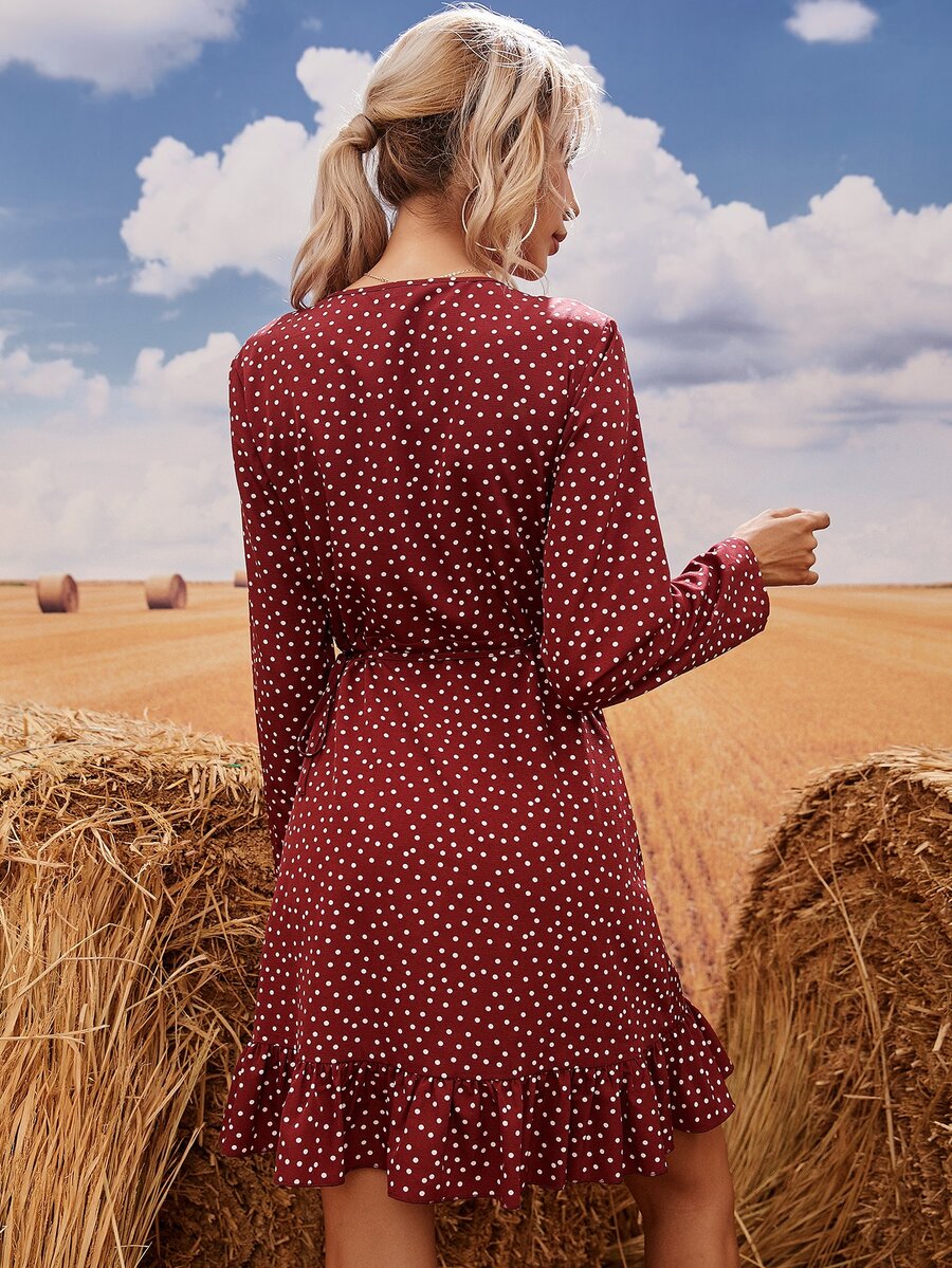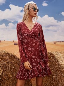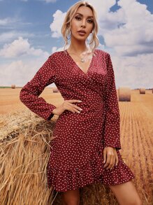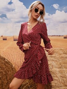 Polka Dot Ruffle Trim Knot Side Wrap Dress