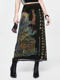 ROMWE Avant New Chinese Style Dark Punk Geisha Figure Print High Slit Black Skirt, Vacation Beach Wear