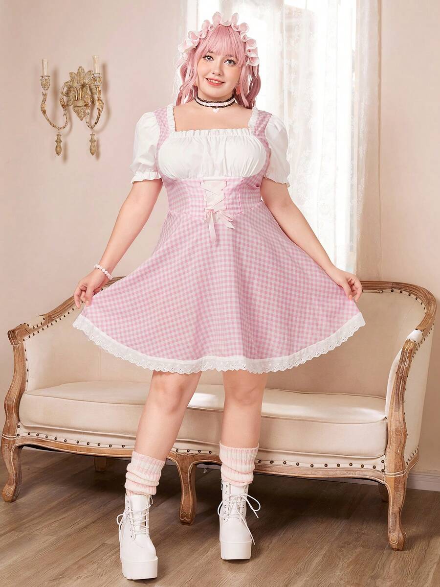 Kawaii Plus Gingham Print Ruched Bust Lace Up Front Dress