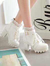 Women Lace & Buckle Decor Lace Up Front Buckle Detail Chunky Heeled Fashion Boots