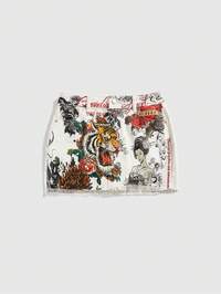 Grunge Punk Y2K Retro Babe Vintage Tiger Vine Faux Tattoo Print Tight Low Waist Denim Mini Skirt