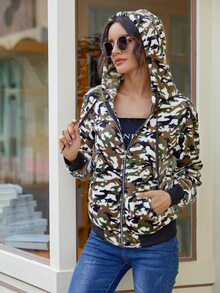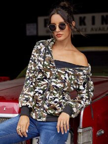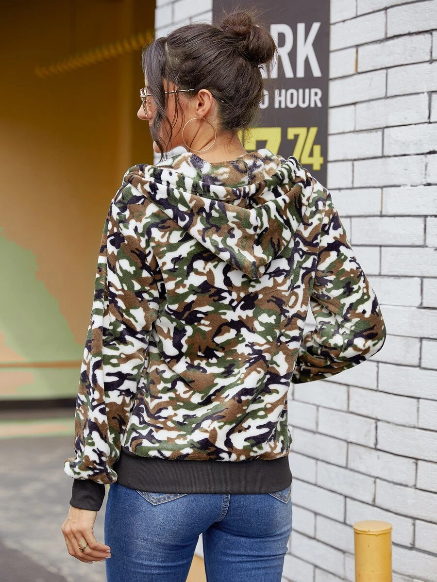 Camo Print Drawstring Hooded Flannel Jacket