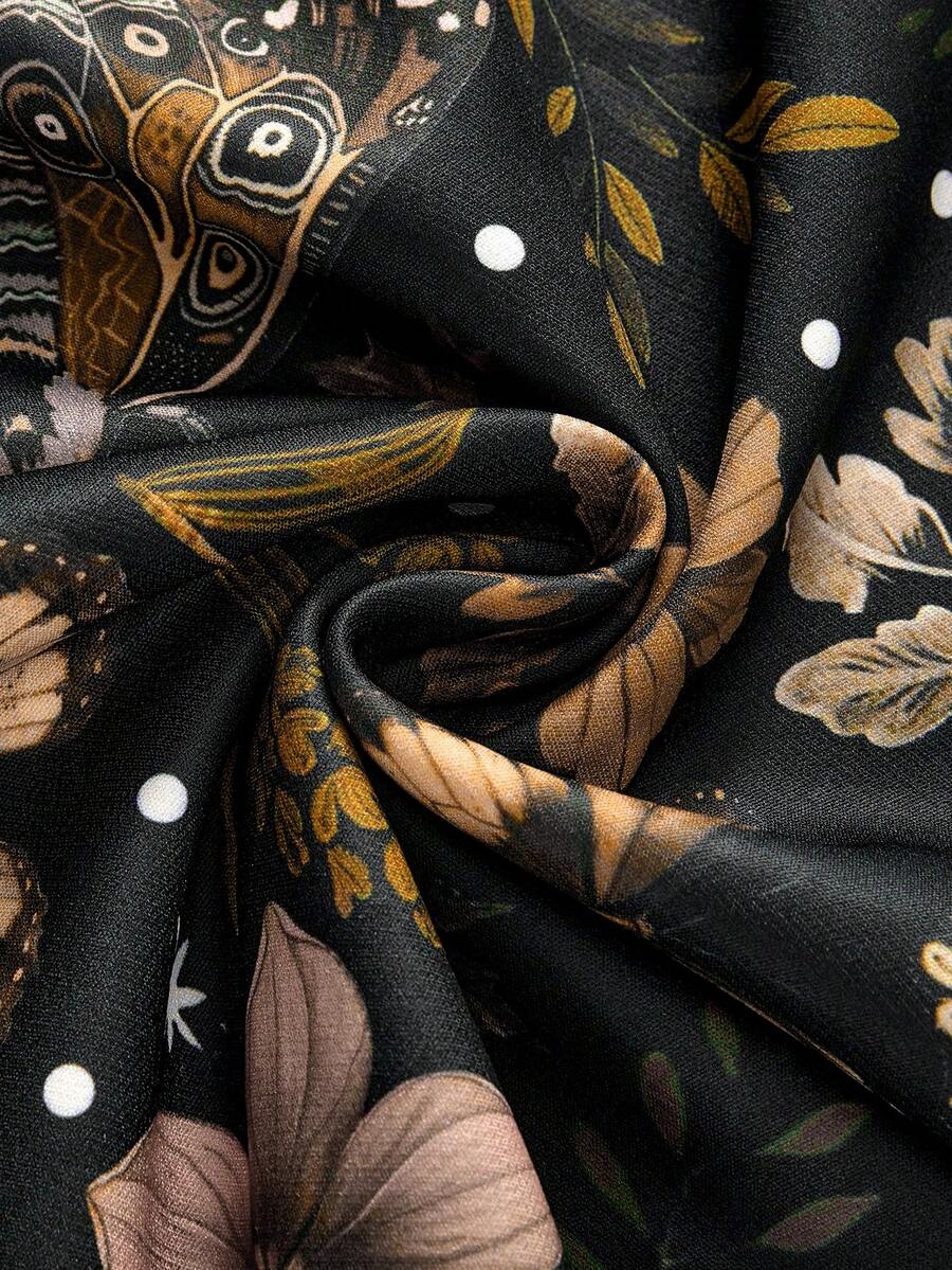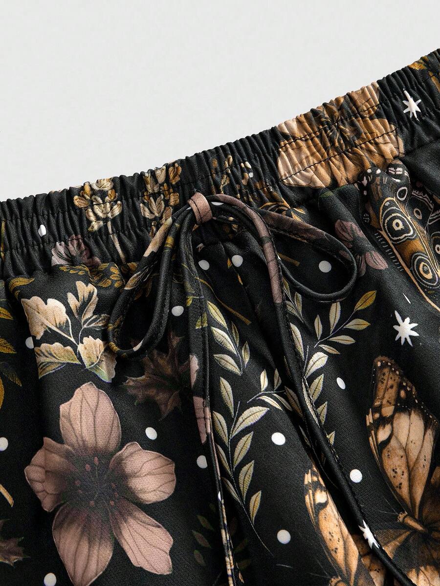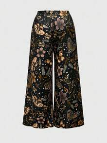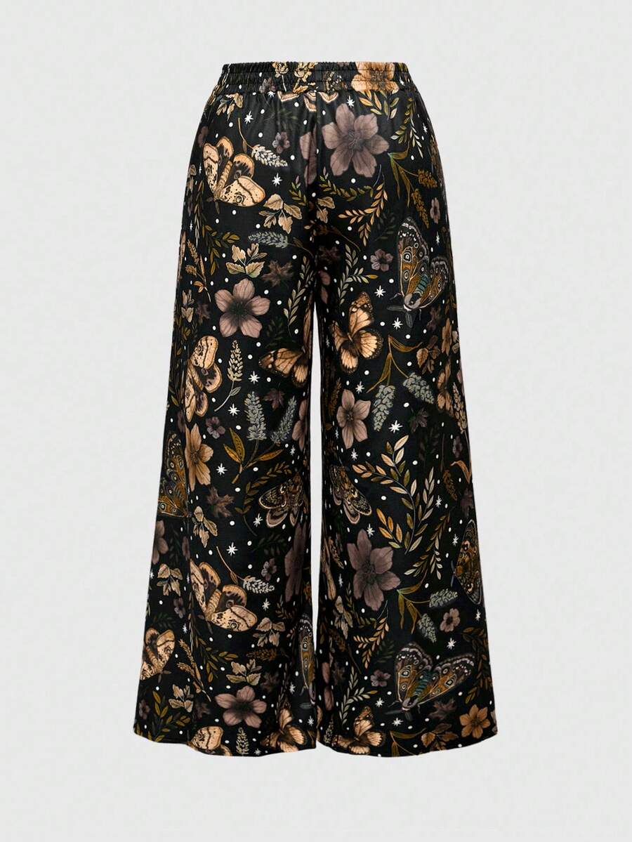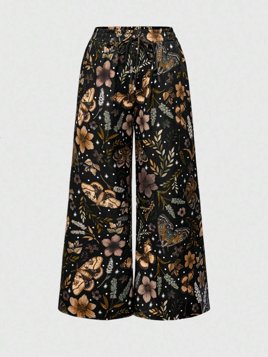 Vintage Floral Rose Brown Fairycore Butterfly Moth Plant Print Women Loose Straight Leg Pants, Autumn/Winter Plus Size Bottoms