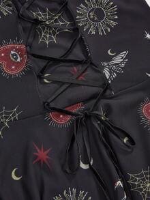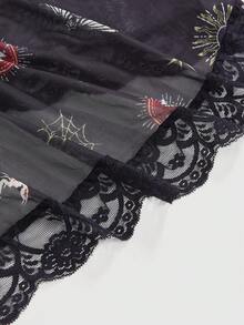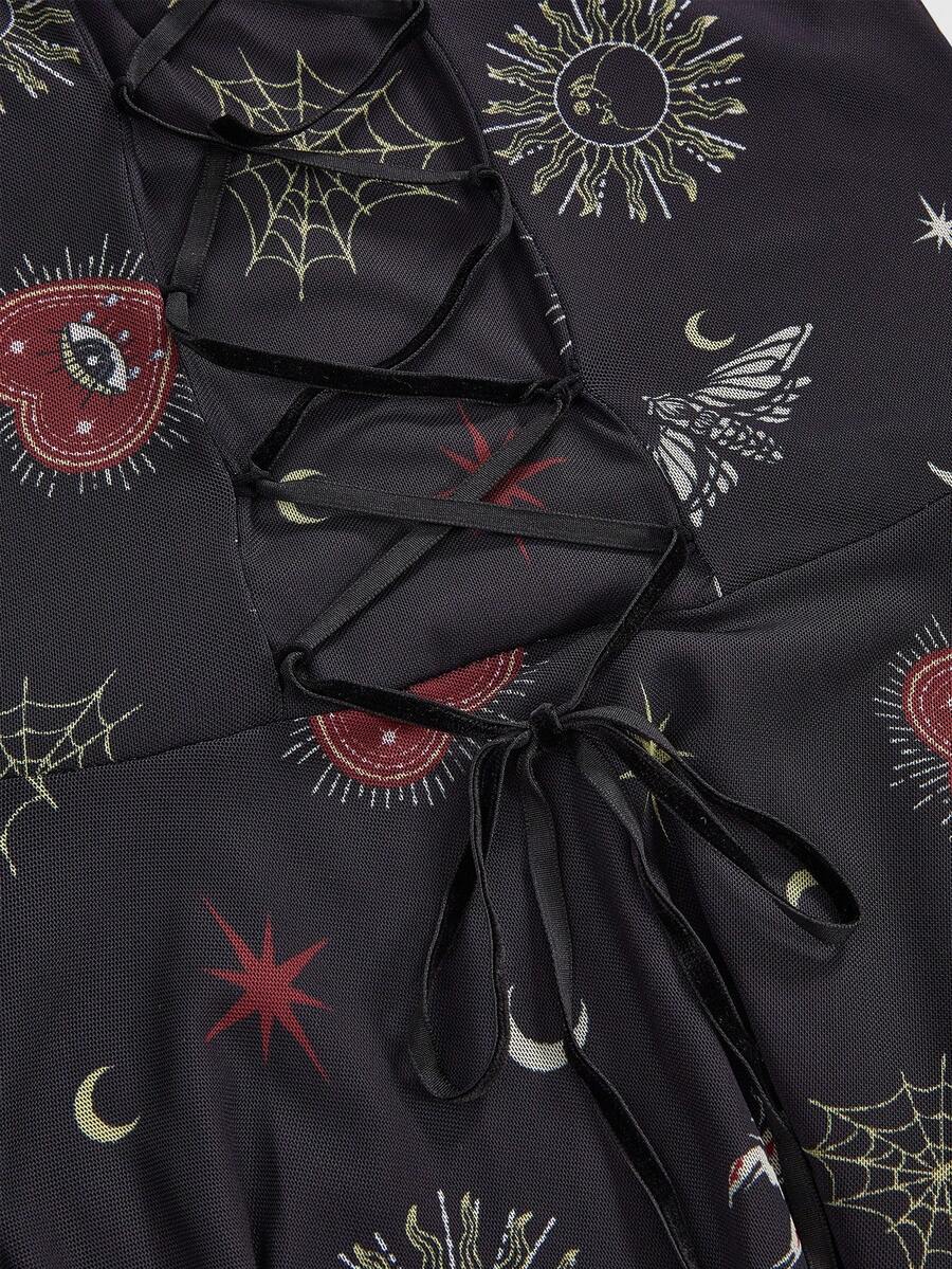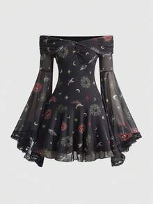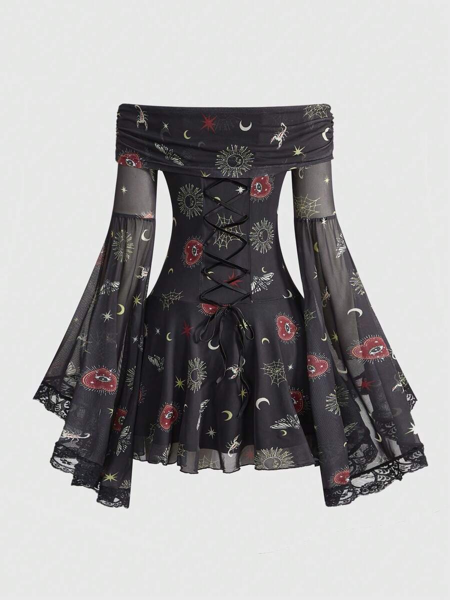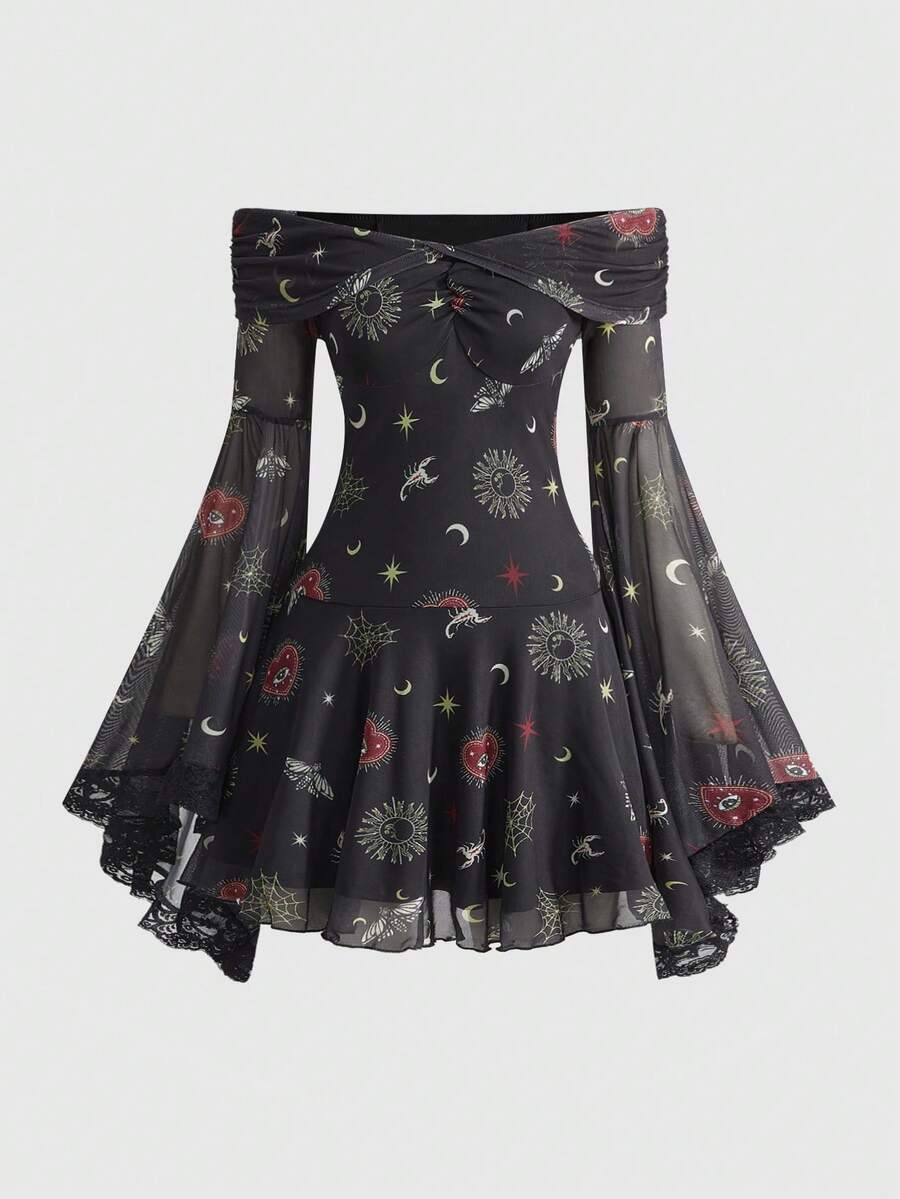 Hippie Glamorous Palace-Style Dark Heart, Scorpion, Star, Sequin, Spider Web All-Over Print Off Shoulder Mesh Dress For Women