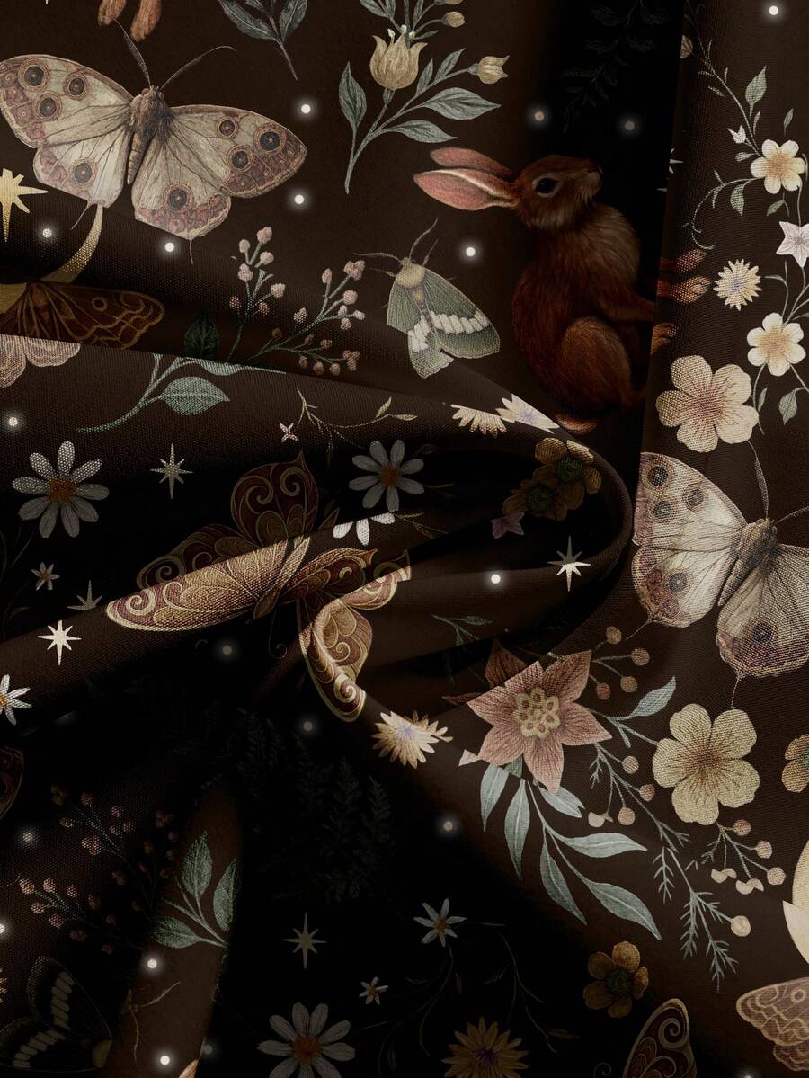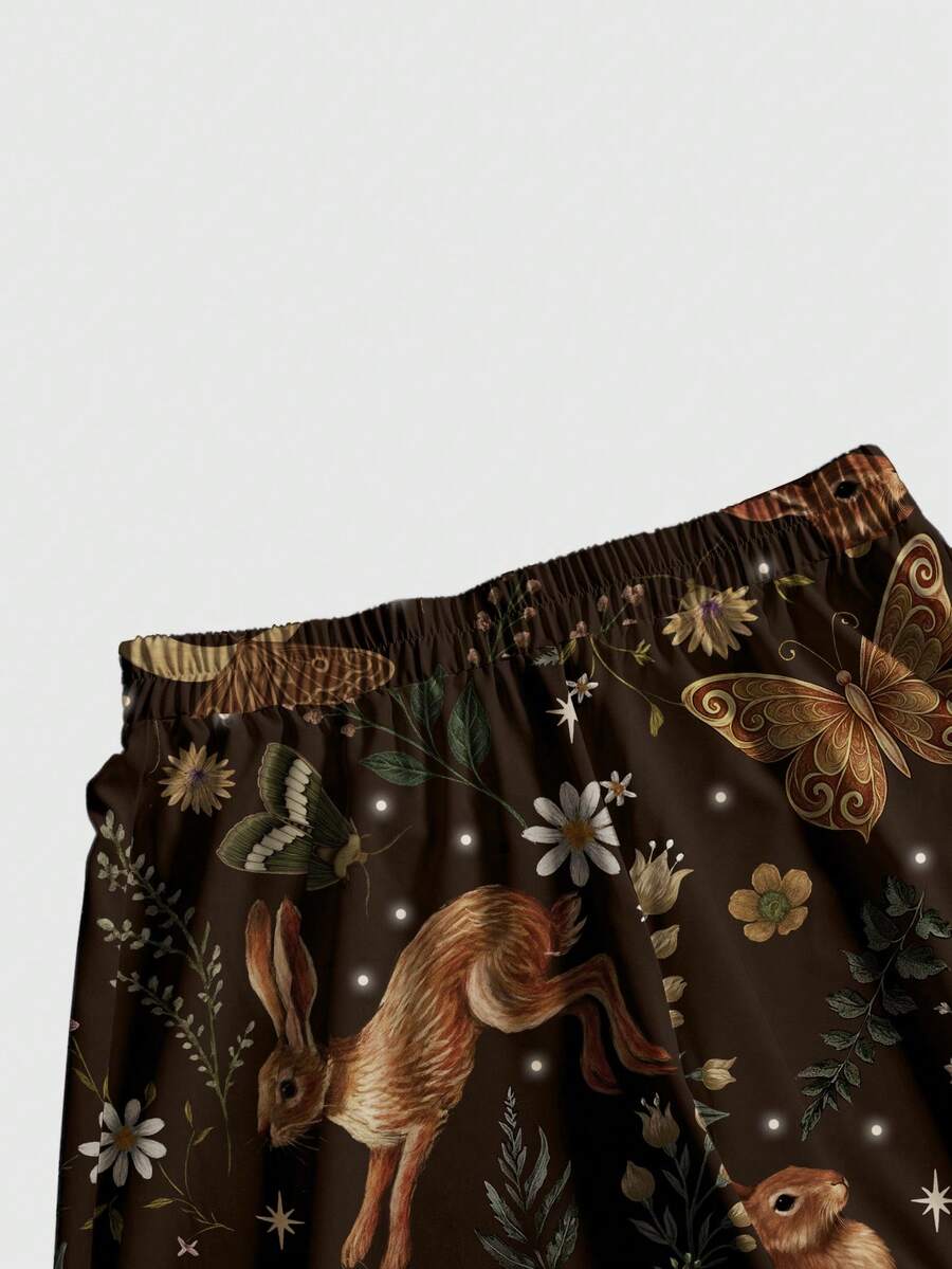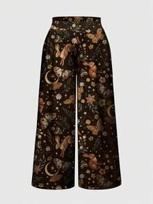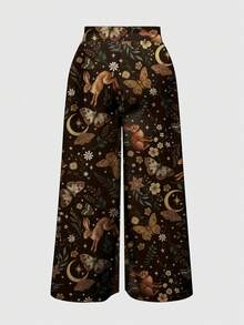 Goth Plus Size Loose Wide Leg Pants With All-Over Floral, Plant, Sun, Moon, Star And Rabbit Butterfly Print, Dark Forest Aesthetic