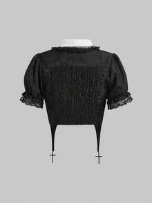 Women's Gothic Vintage Palace Rose Cross Embroidery Pendant Chain Puff Sleeve Blouse